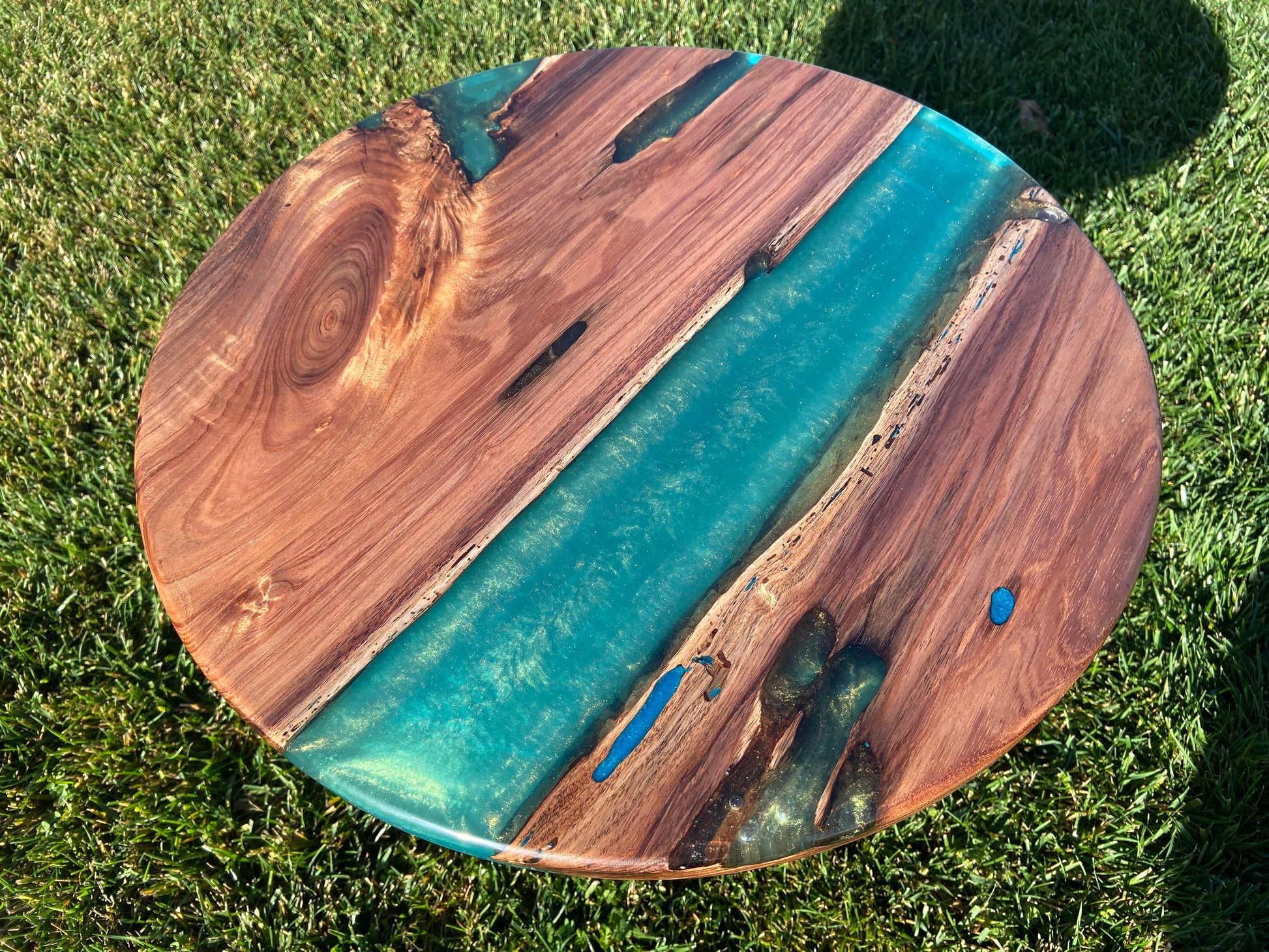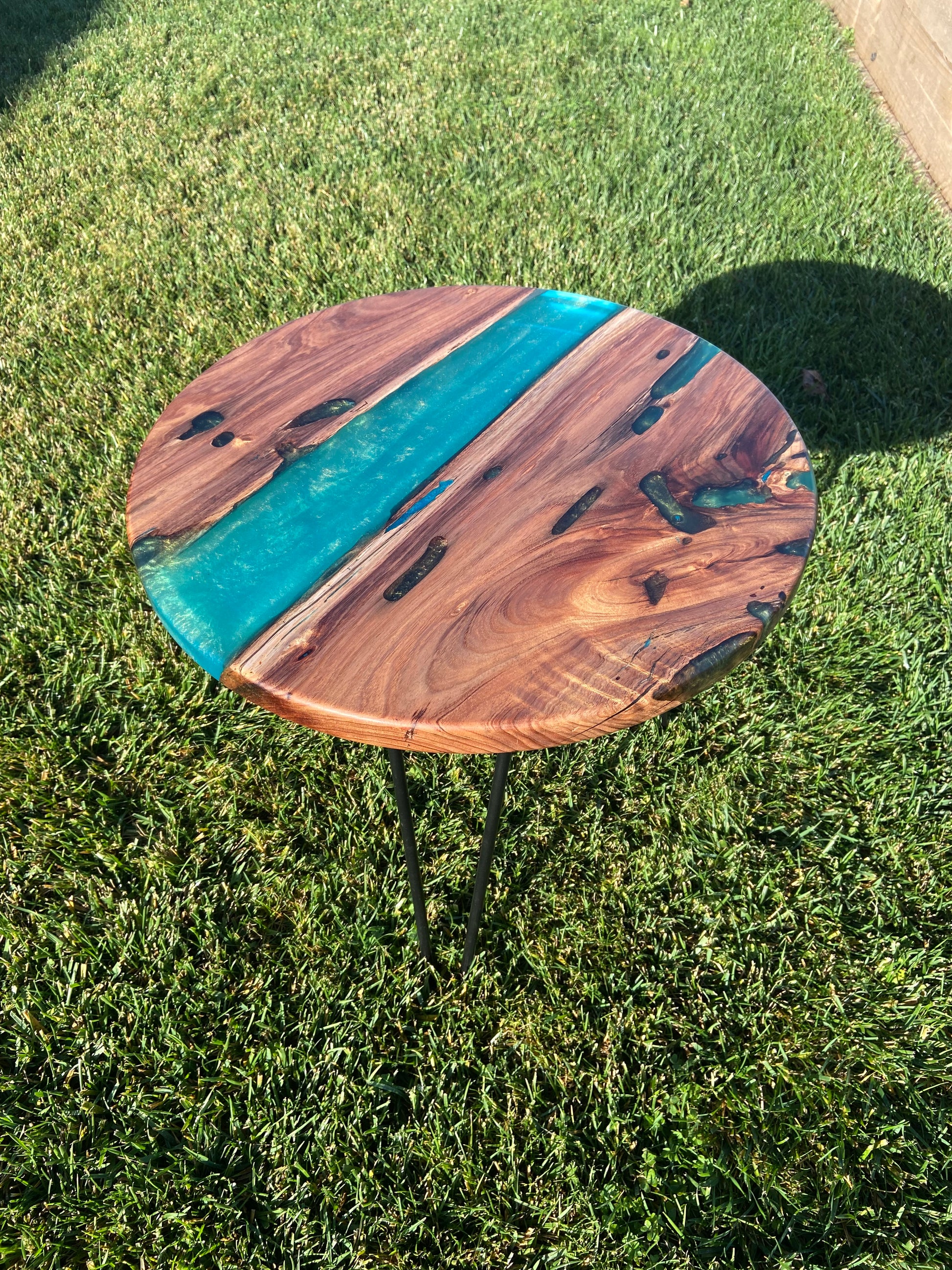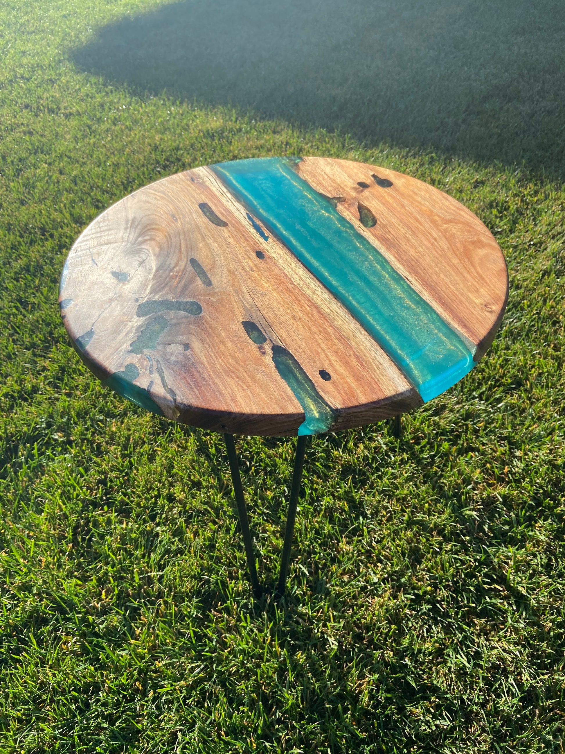 This stunning Blackwood Coffee Table has been made with one slice of timber filled with a epoxy resin which is a stunning blue/green with a gold shimmer. This would make a stunning statement piece for your home or business.