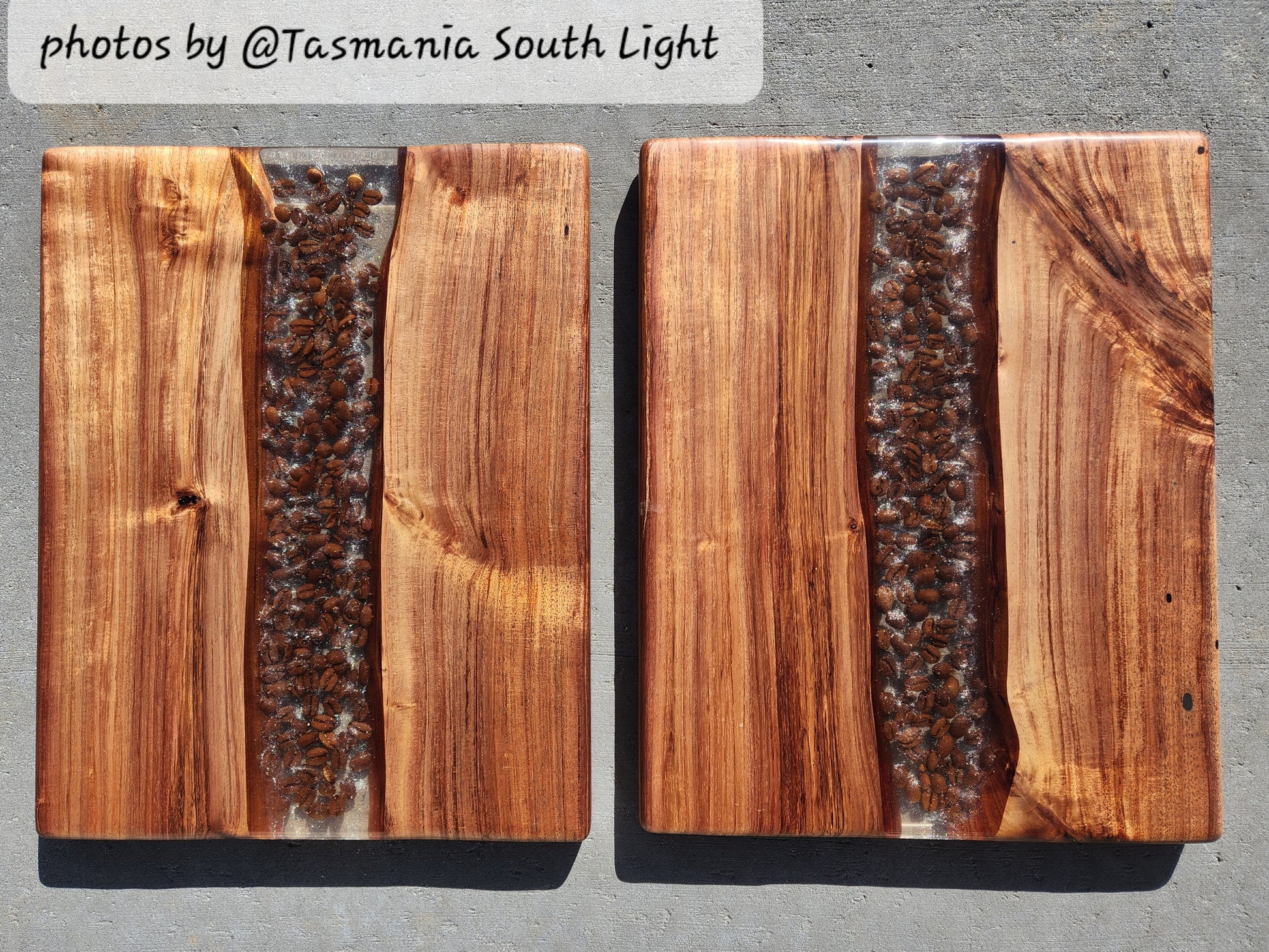 You can be the proud owner of a one of a kind Blackwood Tasmanian Timber board combined with a Coffee Beans and epoxy resin, mixed and poured by hand in my Tasmanian Studio. A delicate rounded edge and organic shape makes this Board a joy to touch.