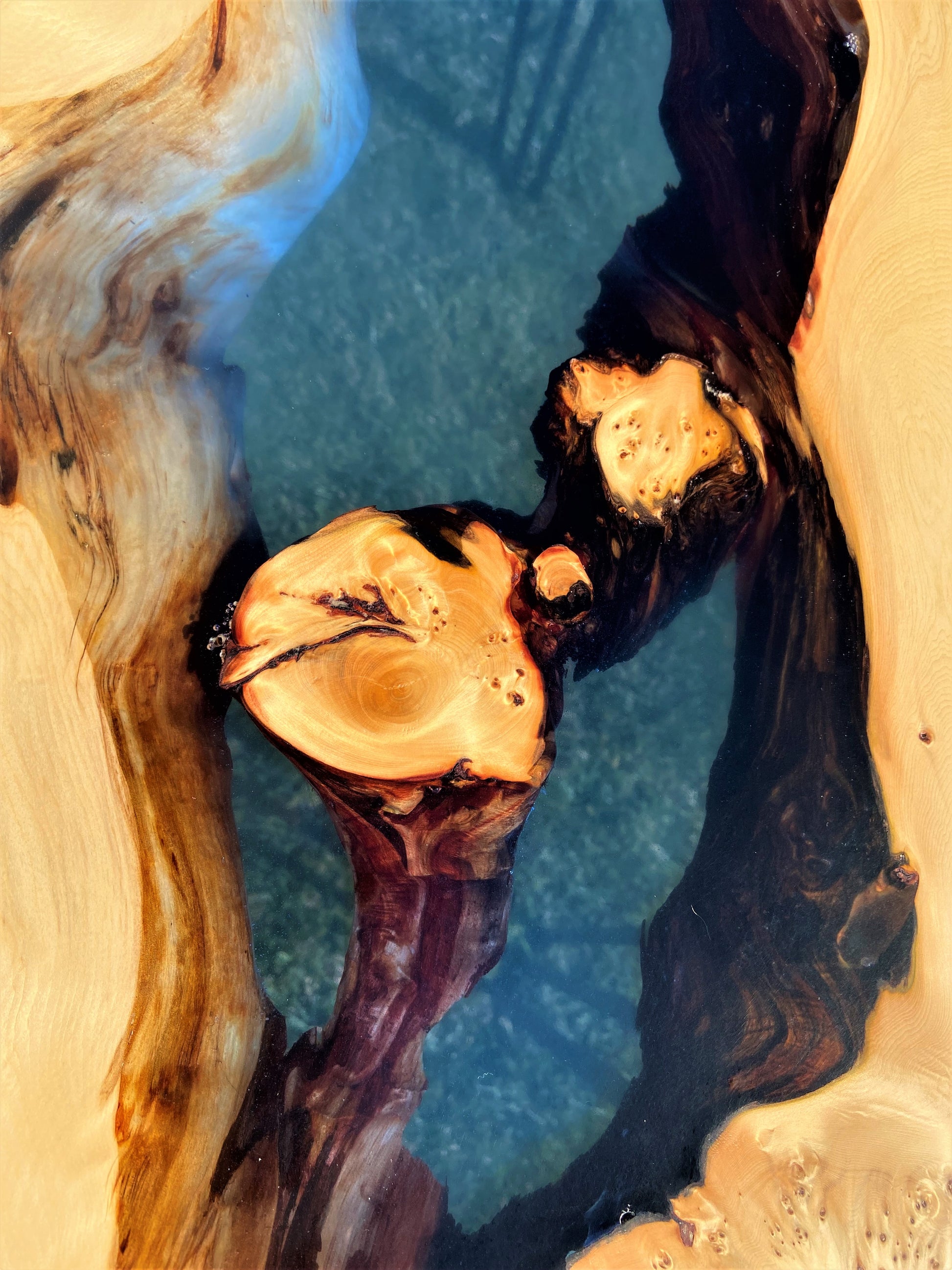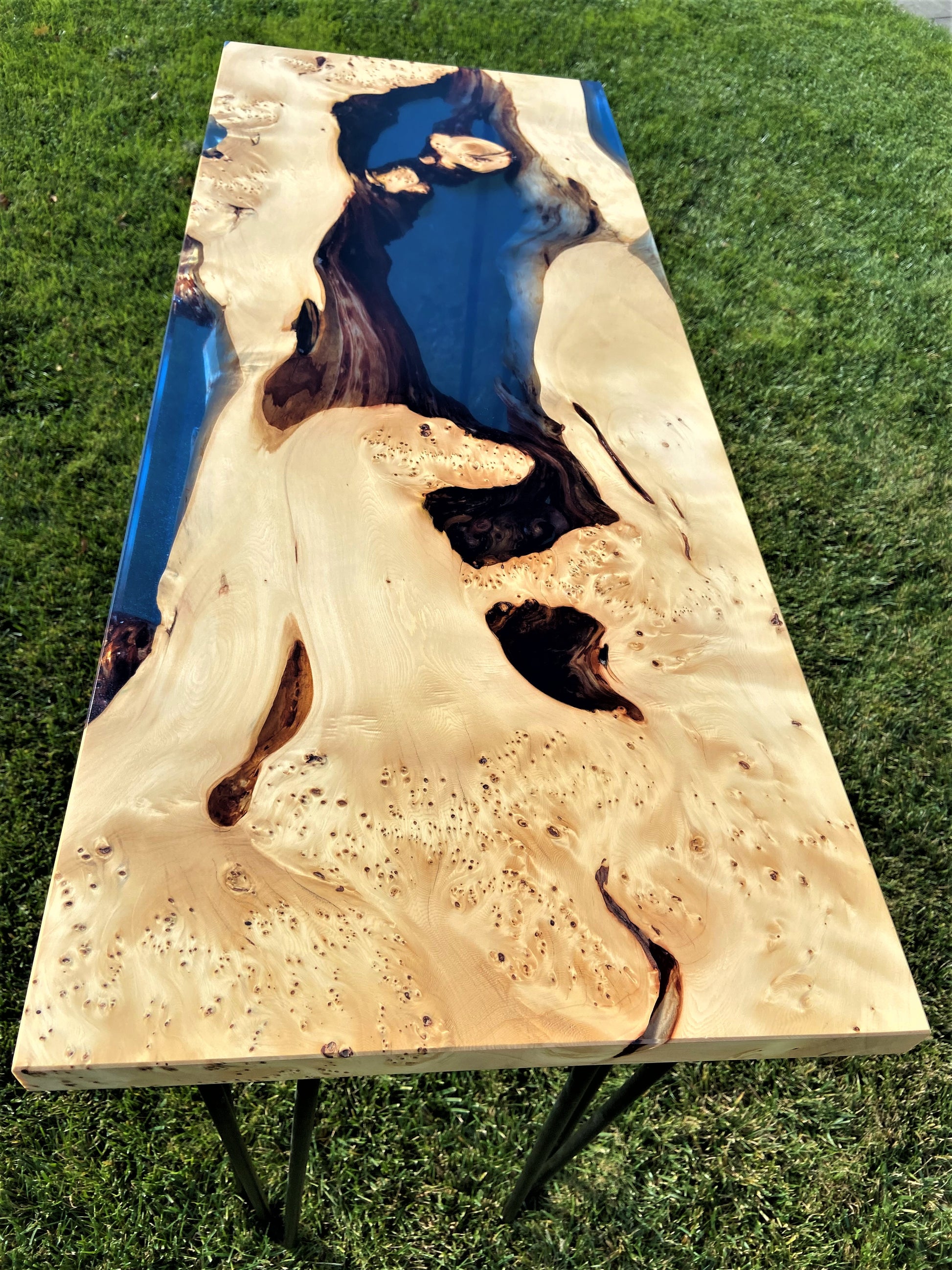 This stunning Feature Table is made with a slab of Birds Eye Huon Pine, the knots and features have been filled with a translucent blue resin. Hairpin legs raise this Tasmanian Timber (provided by Roy as the Sculptured Gallery) and finished off with a silky smooth natural finish.