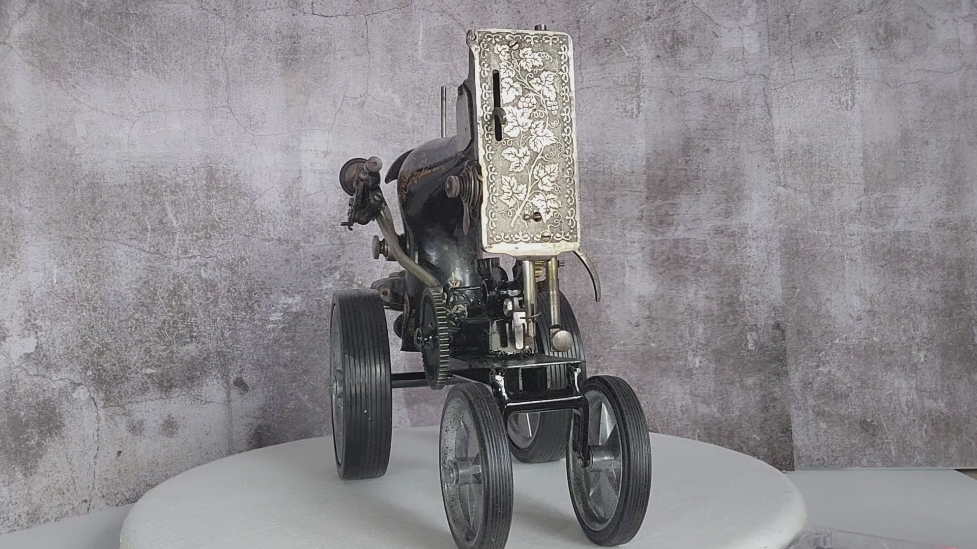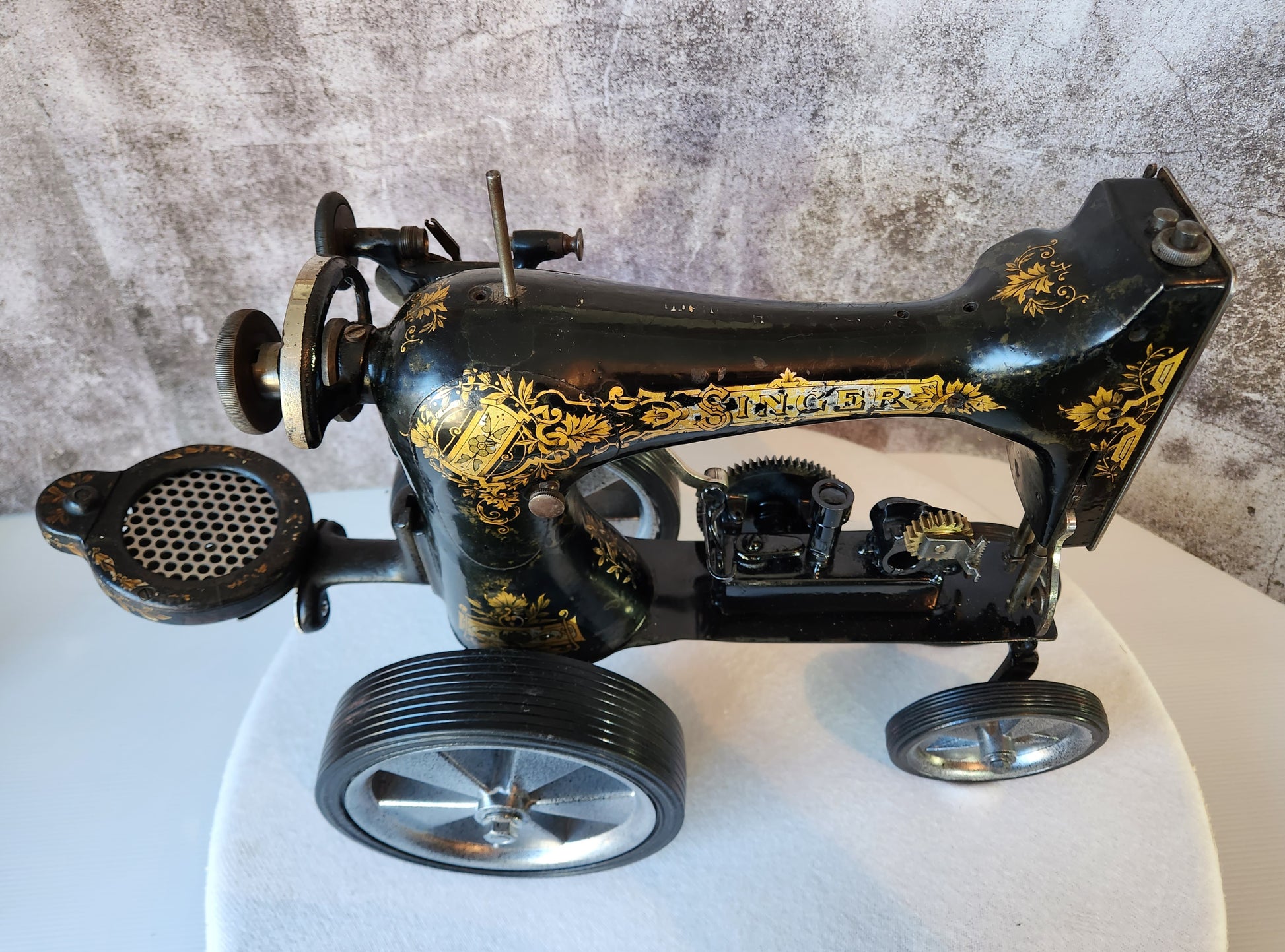 The gold paint has been worn by use and the scratches are also gained over time. The only added component is the wheels, to turn this sewing machine into a unique display piece.